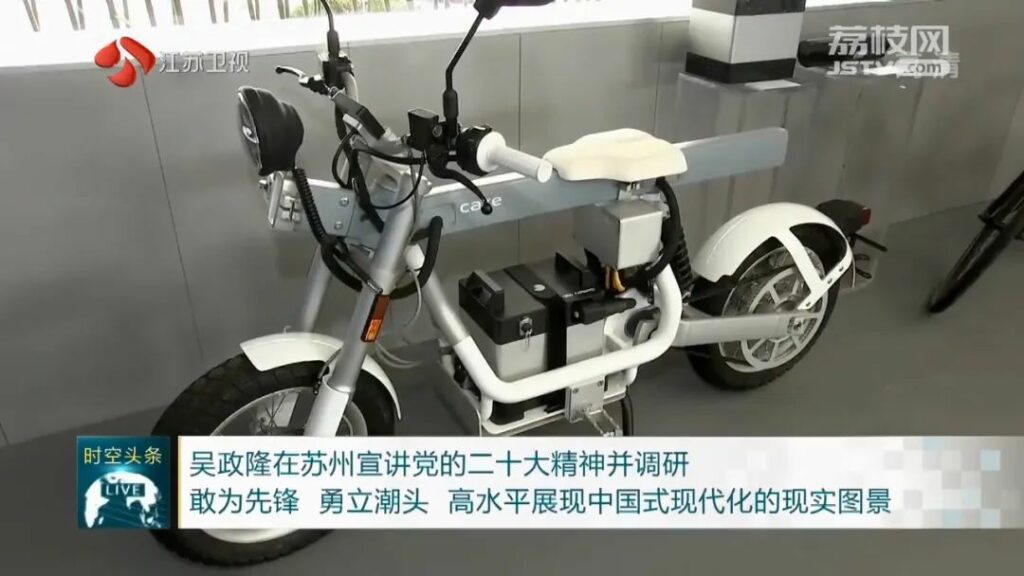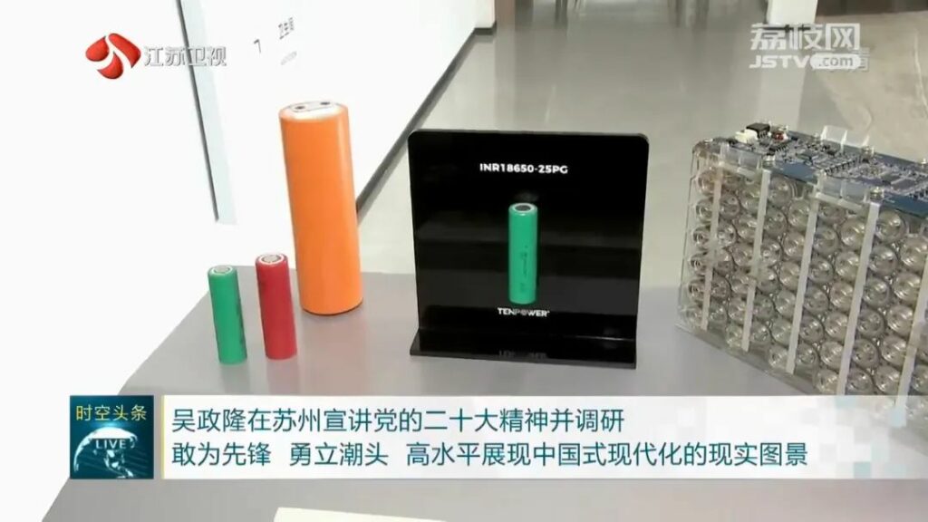 董事长陈锴为吴政隆书记介绍大圆柱储能电池、小圆柱三元锂电池。
